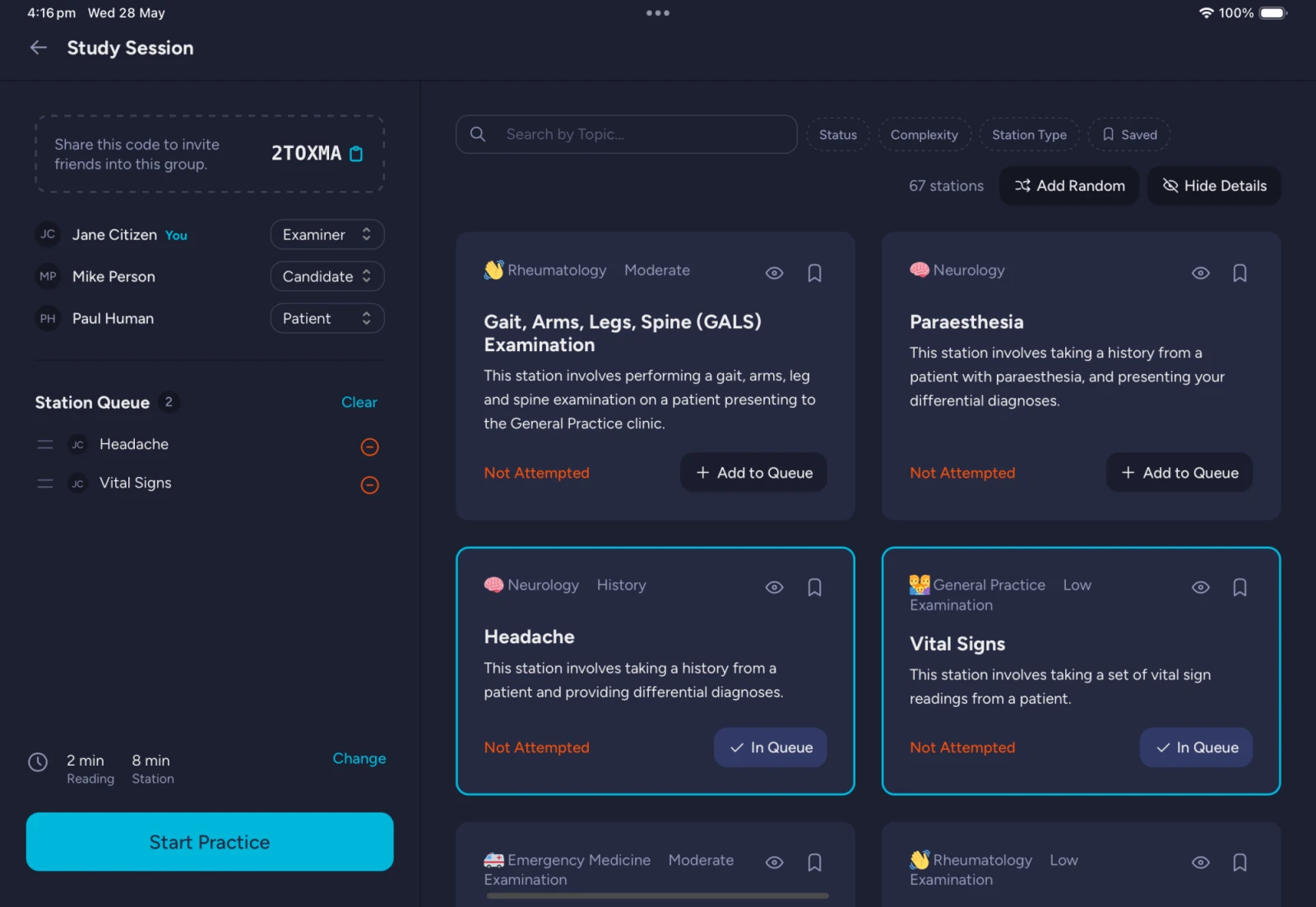 Find the stations you want to practise by browsing through the library by station type or topic area, and add them to your group's station queue.