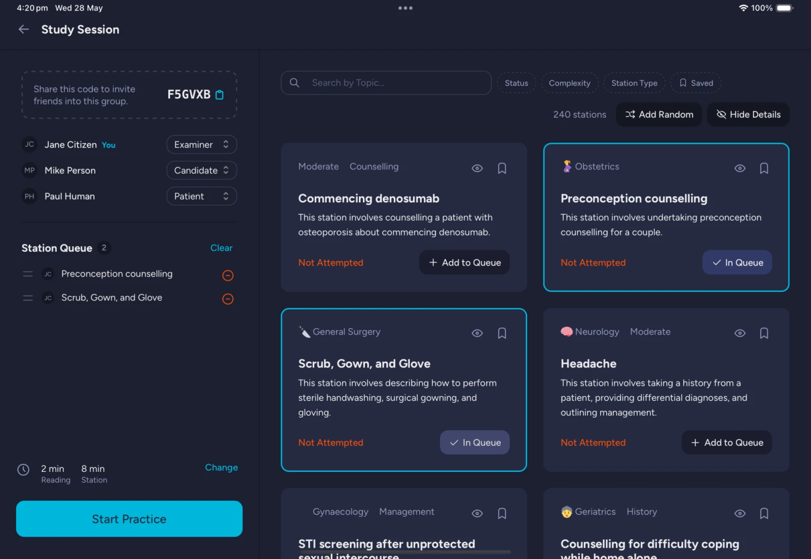 Find the stations you want to practise by browsing through the library by station type or topic area, and add them to your group's station queue.